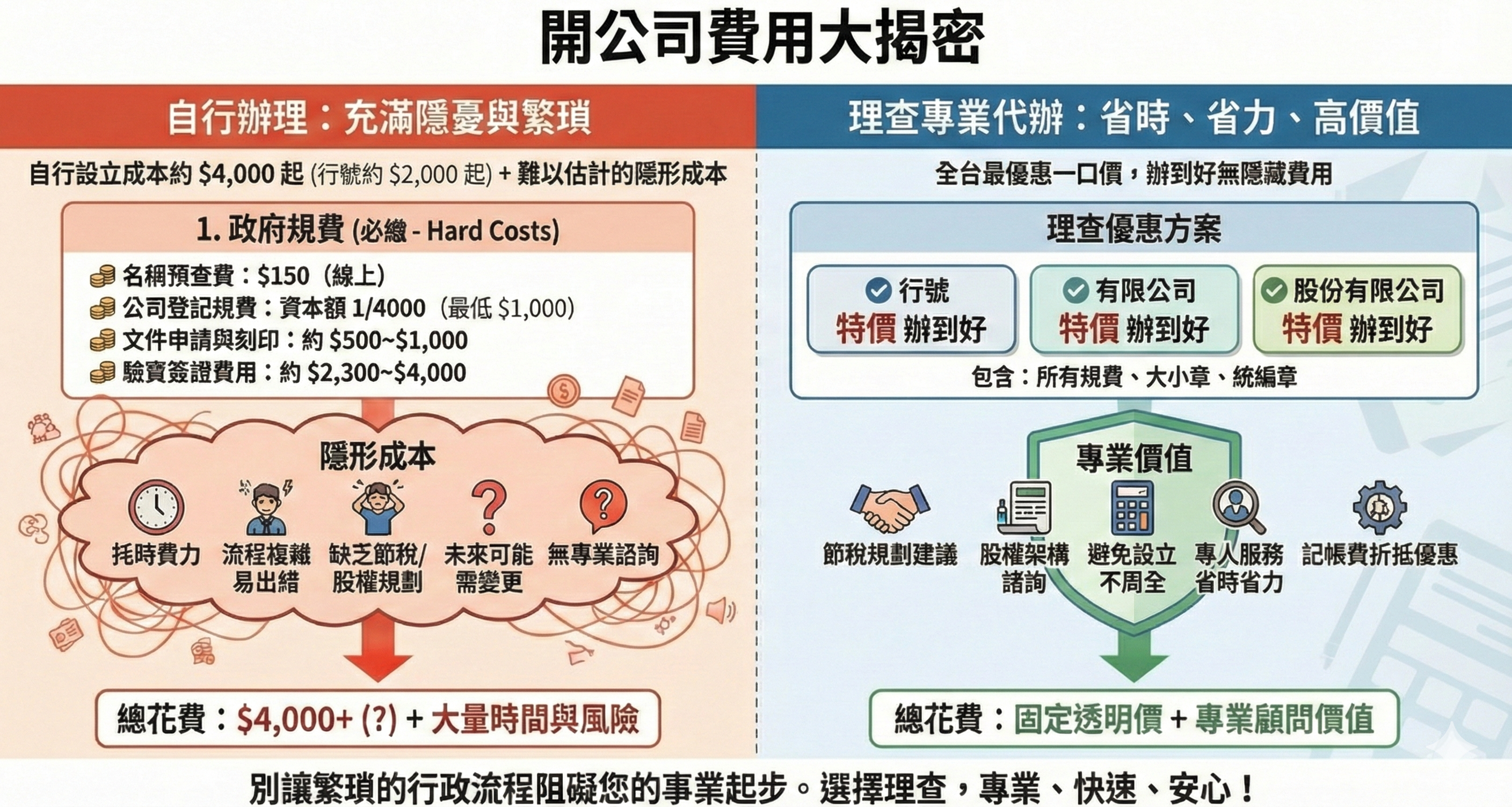 除了政府規費,您還需要考量代辦費與隱形成本,理查能以專業的服務協助您設立,省時省力也能避免設立不周全未來再變更的繁瑣事宜。